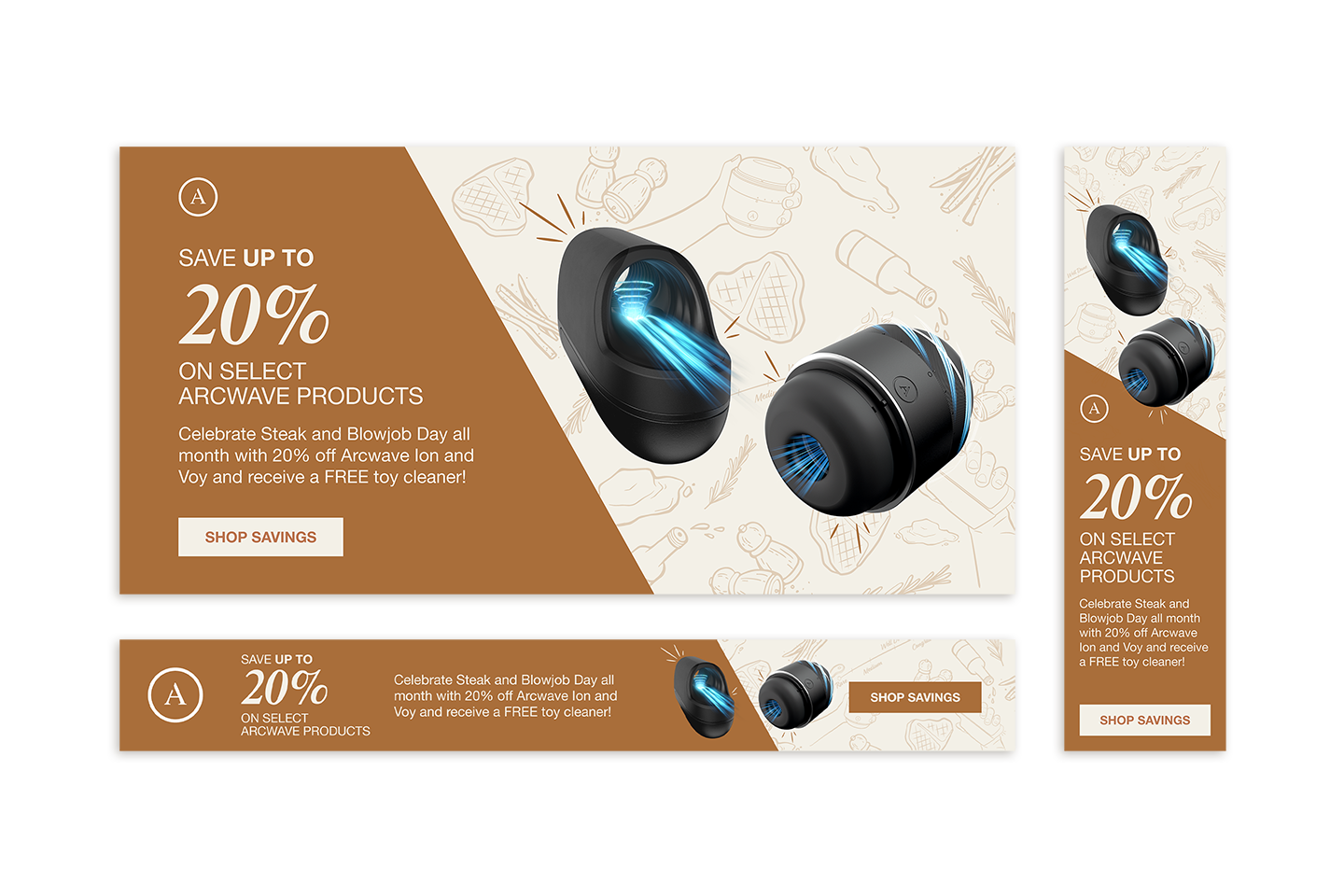 Arcwave's Q1 sale offered up to 20% off their premium male toys all month long for Steak & BJ day with a fun campaign to match. Working off the steakhouse inspired concept, I created posters, tent cards, and digital banners, complemented with steak-themed illustrations.